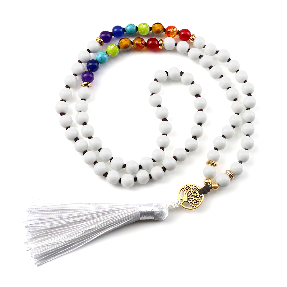 Life Tree Thread Necklaces Handmade 7 Chakra Natural Stone Tiger Eye Beads Necklaces Women Men 108 Mala Tibetan Buddhist Jewelry Bright White – Sumsfashion